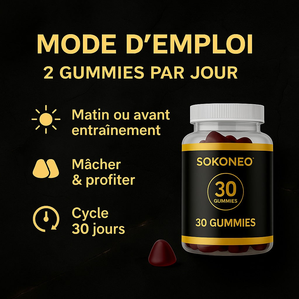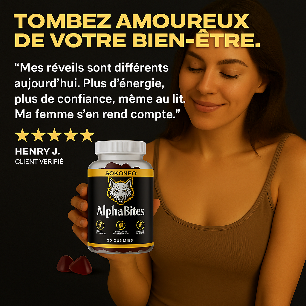 Un esprit affûté, un corps prêt à performer, une confiance qui rugit : tout commence par deux gummies noir & or. Cliquez sur « Ajouter au panier », choisissez le paiement à la livraison et libérez l’Alpha qui sommeille en vous grâce à Sokoneo™ AlphaBites gummies !