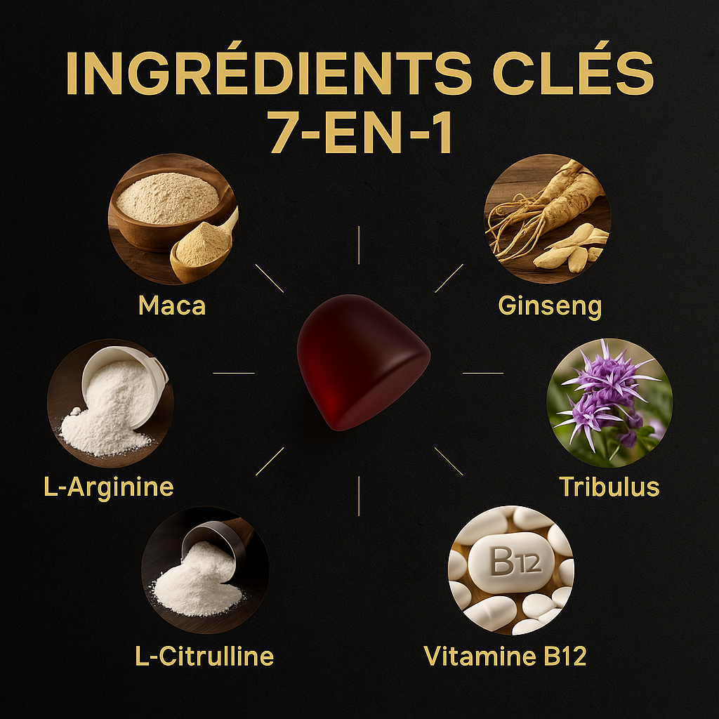Plongez dans une nouvelle génération de gummies : une formule noire & dorée qui concentre la force de 7 actifs premium — L-Arginine, L-Citrulline, Maca bio, Ginseng rouge, Tribulus terrestris, Vitamine B12 et Zinc bisglycinate. Chaque bouchée fruitée délivre un soutien complet pour l’énergie, la circulation sanguine et la vitalité masculine, sans caféine ni gélules à avaler.