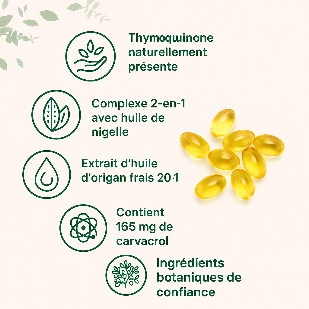• Carvacrol + thymoquinone = duo antimicrobien complet pour affronter les changements de saison et les environnements tropicaux.